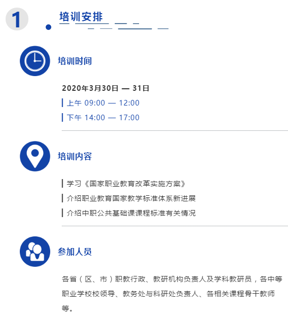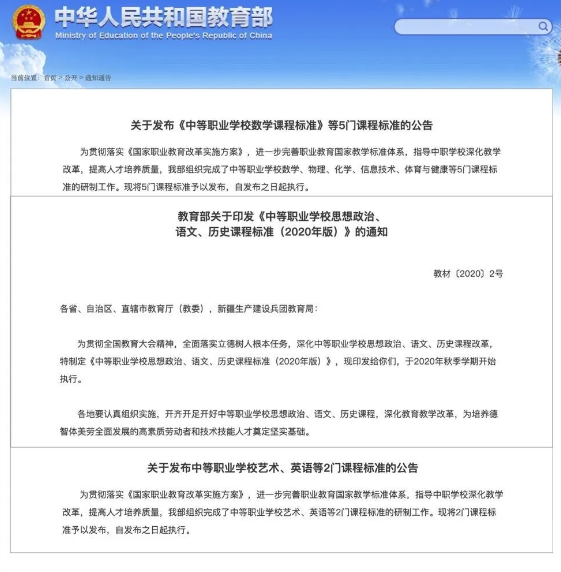 近期,教育部陸續(xù)頒布了中等職業(yè)學(xué)校思想政治、語文、歷史、數(shù)學(xué)、英語、信息技術(shù)、體育與健康、物理、化學(xué)、藝術(shù)10門公共基礎(chǔ)課的課程標(biāo)準(zhǔn)。為貫徹落實《國家職業(yè)教育改革實施方案》《關(guān)于加強和改進(jìn)新形勢下大中小學(xué)教材建設(shè)的意見》,落實立德樹人根本任務(wù),深化中等職業(yè)學(xué)?!敖處煛⒔滩?、教法”改革,幫助廣大學(xué)校和教師更好地領(lǐng)會并掌握各科課程標(biāo)準(zhǔn),決定開展中等職業(yè)學(xué)校10門公共基礎(chǔ)課課程標(biāo)準(zhǔn)培訓(xùn)。